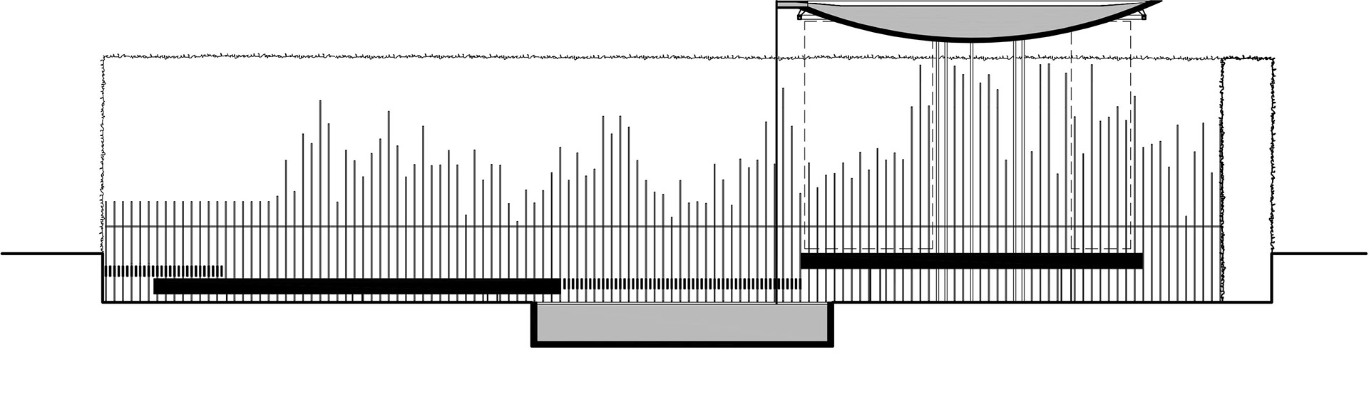 The project was inspired by the work of sculptor Barbara Hepworth and directly references the juxtaposition of her bronze sculptural interventions set within the naturalistic simplicity of her own garden in St Ives. The feature elements – Fence, Bridge and Pavilion, are the physical manifestation of a piece of music commissioned by the Hepworth Trust, the sound-wave pattern re-imagined as a multitude of linear steel flats forming the various elements. A 4.1m spun steel dish forms the roof of the pavilion, providing a high-level reservoir, water flows over the edge and into the pool below, casting reflections onto the pavilion floor.